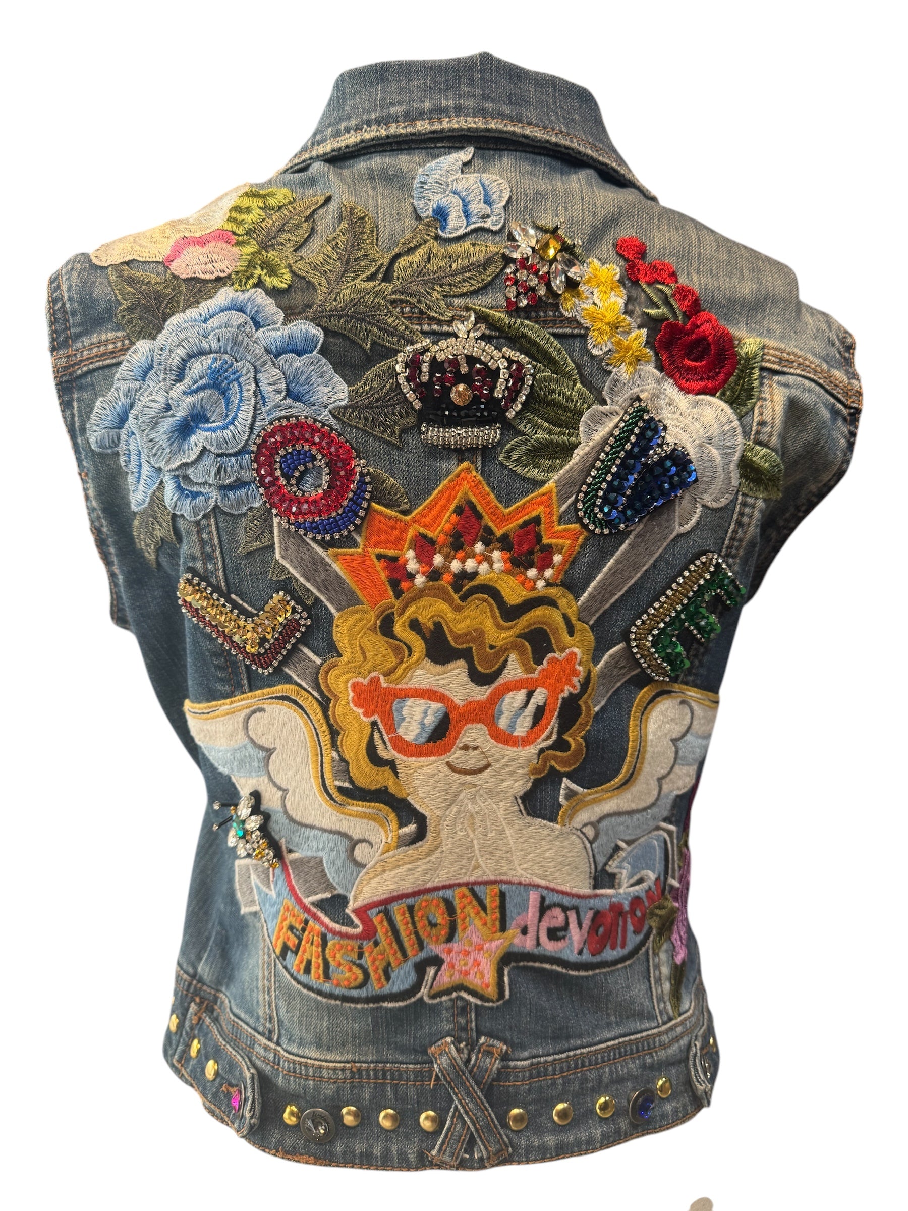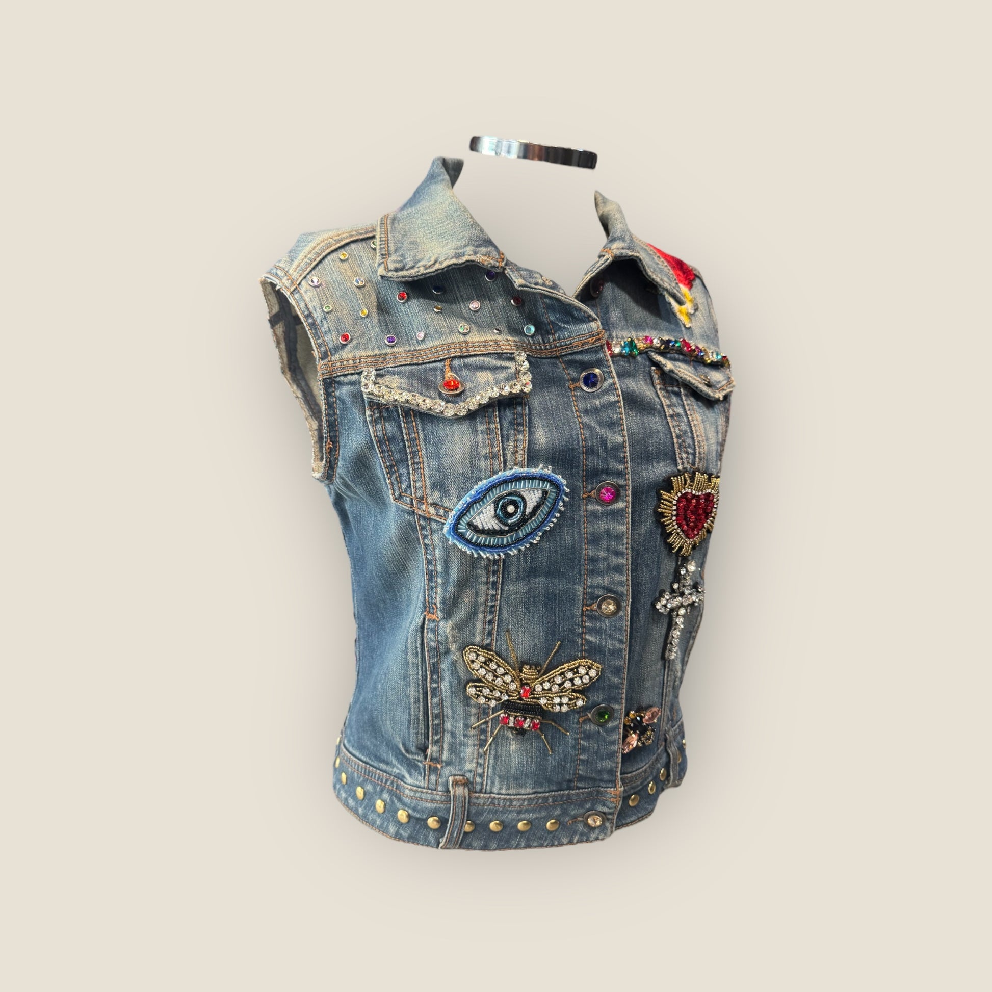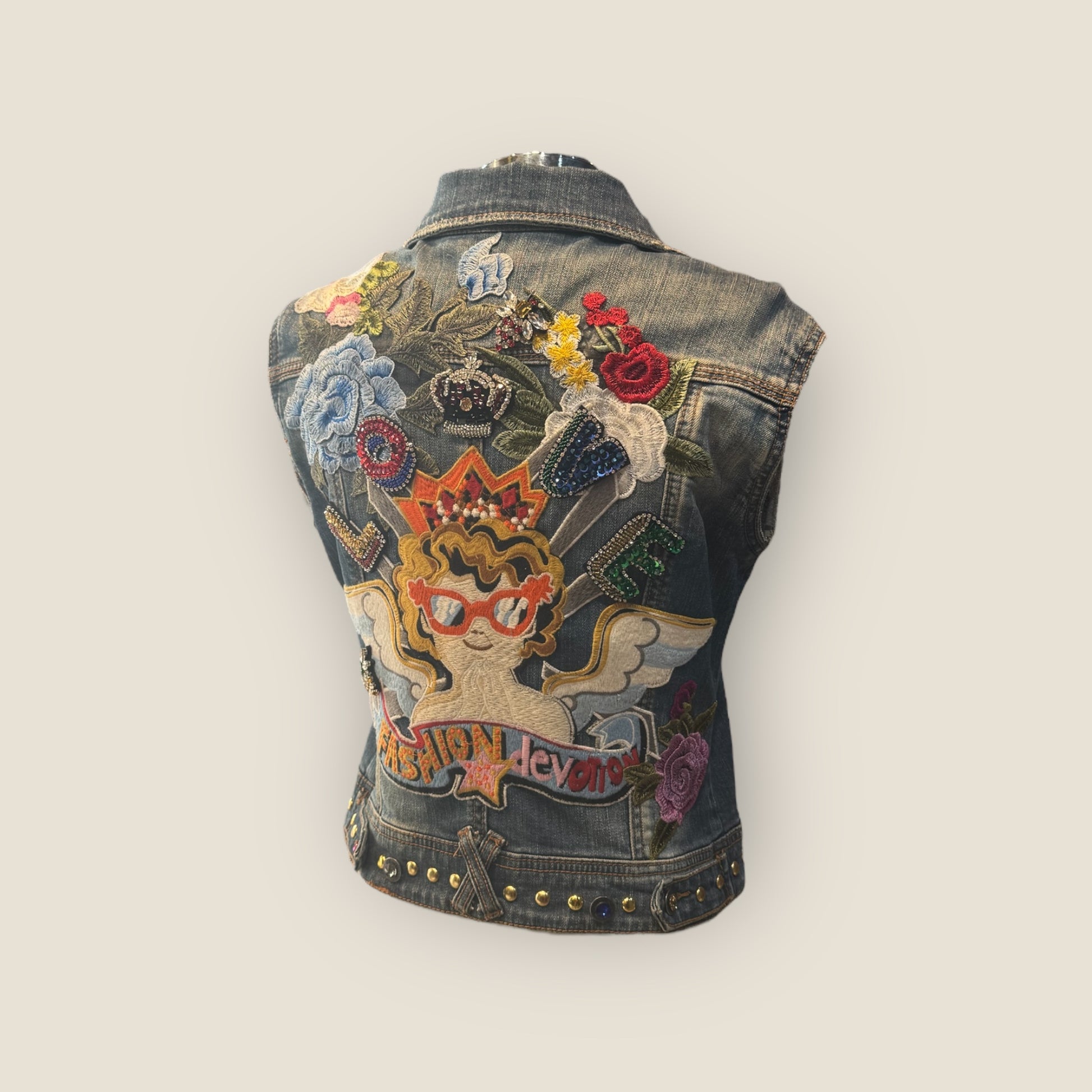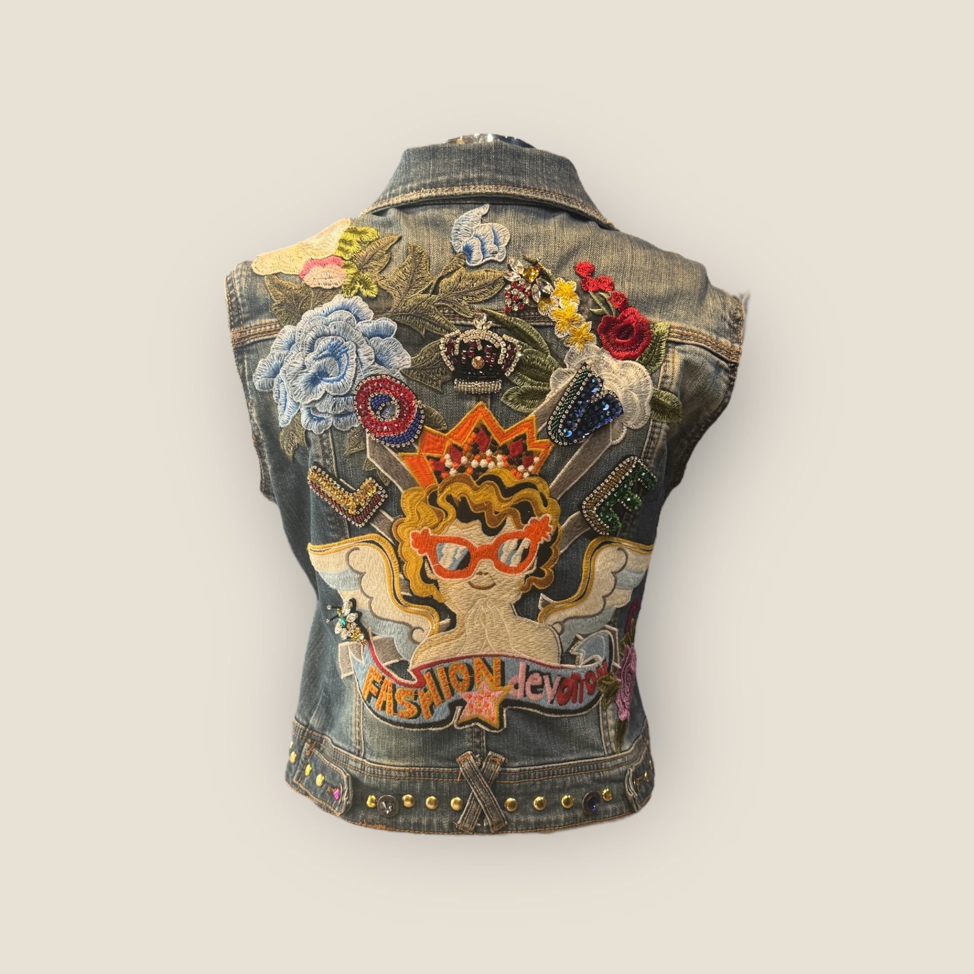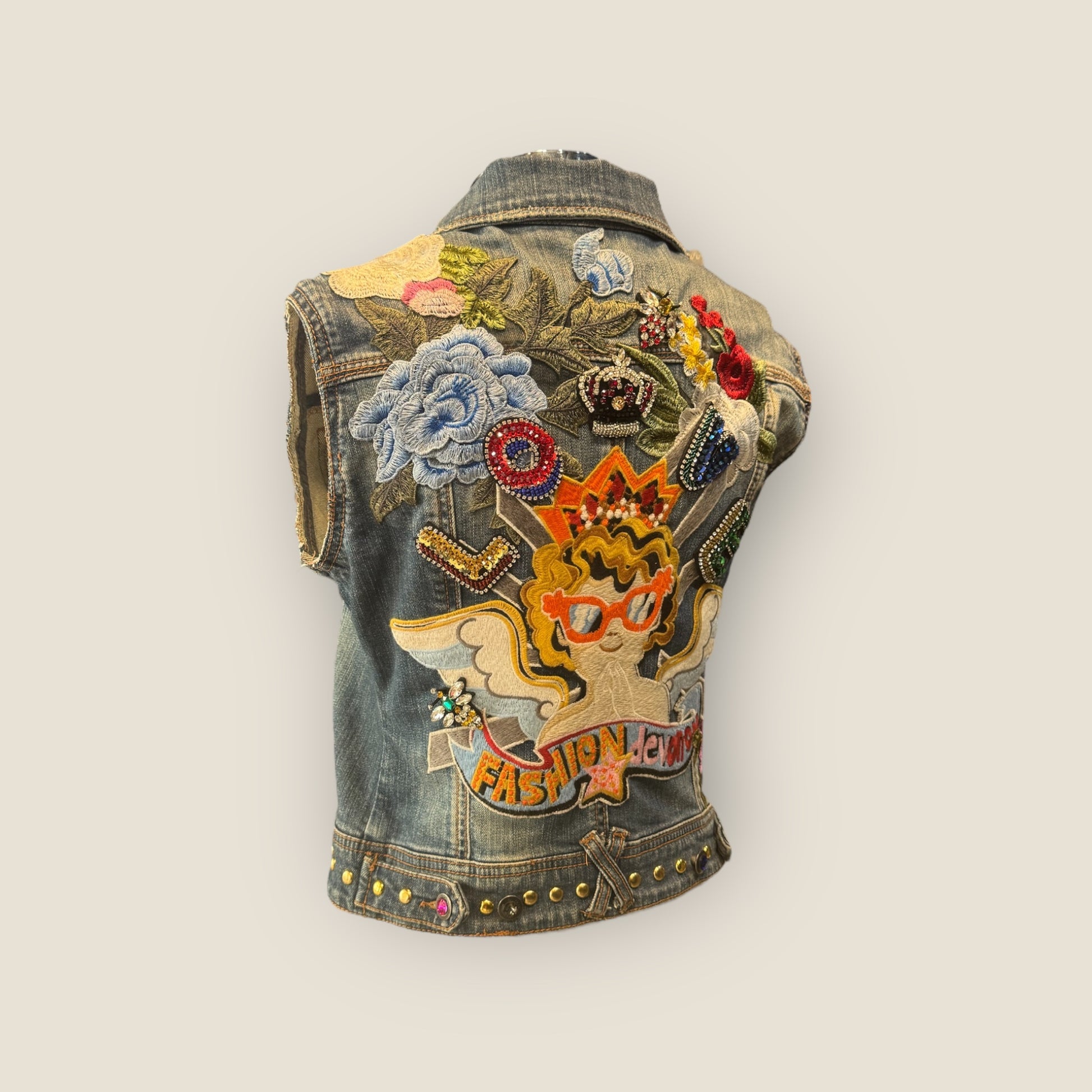 Sumérgete en el mundo del arte wearable con nuestro extraordinario chaleco vaquero bordado, una pieza única que fusiona la tradición del denim con la expresión artística más vibrante. Este chaleco sin mangas es mucho más que una prenda de vestir; es un lienzo de creatividad que cuenta historias a través de cada puntada.