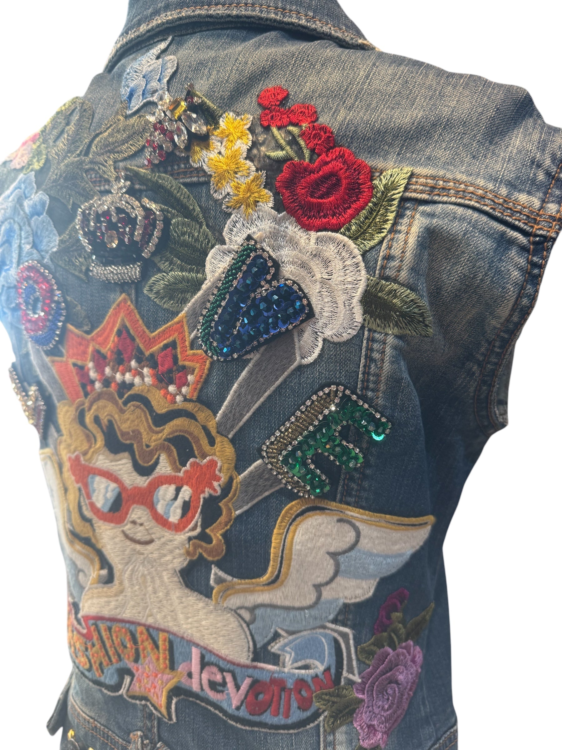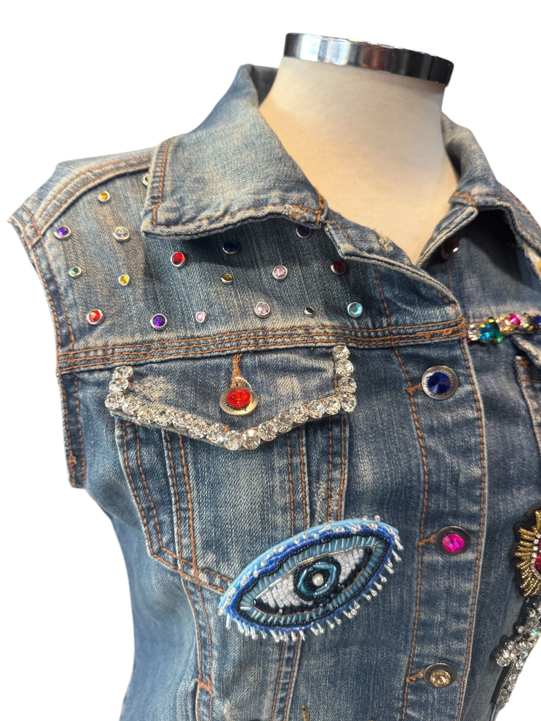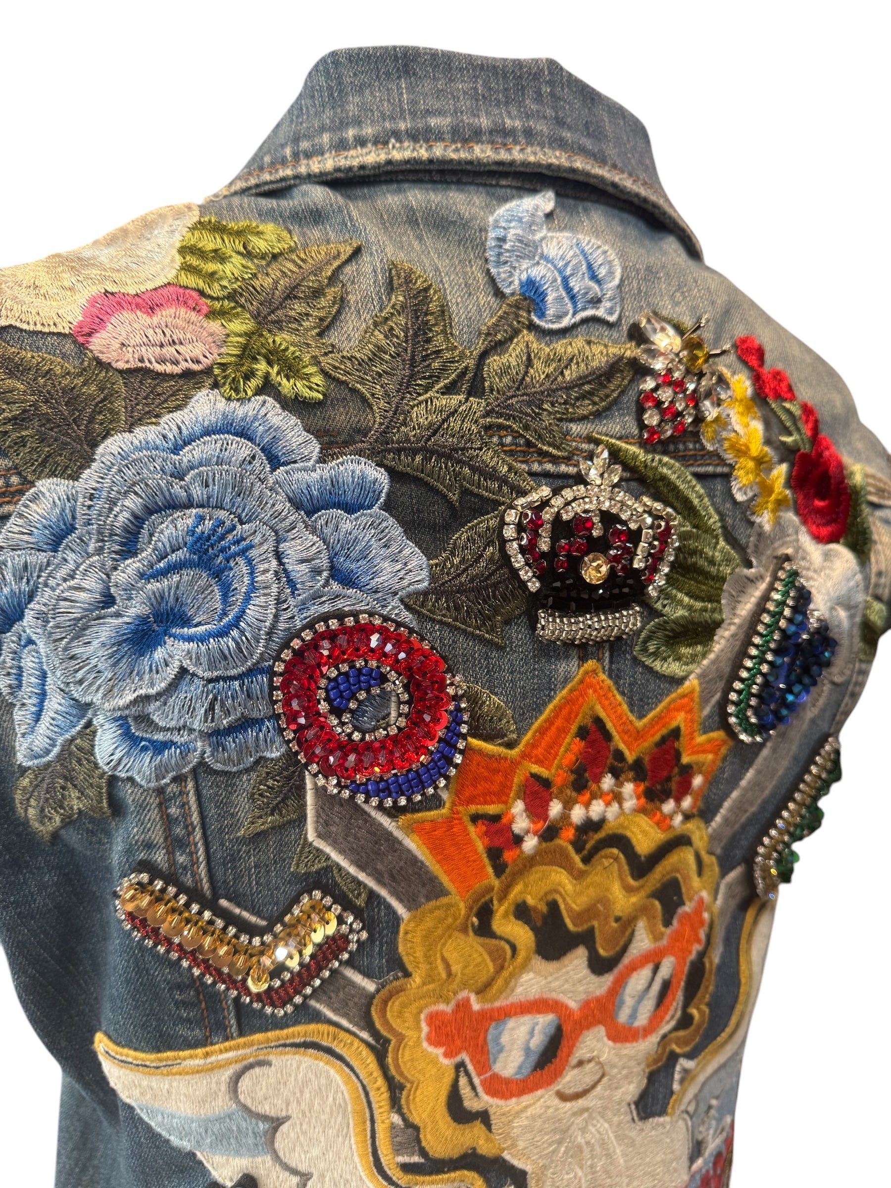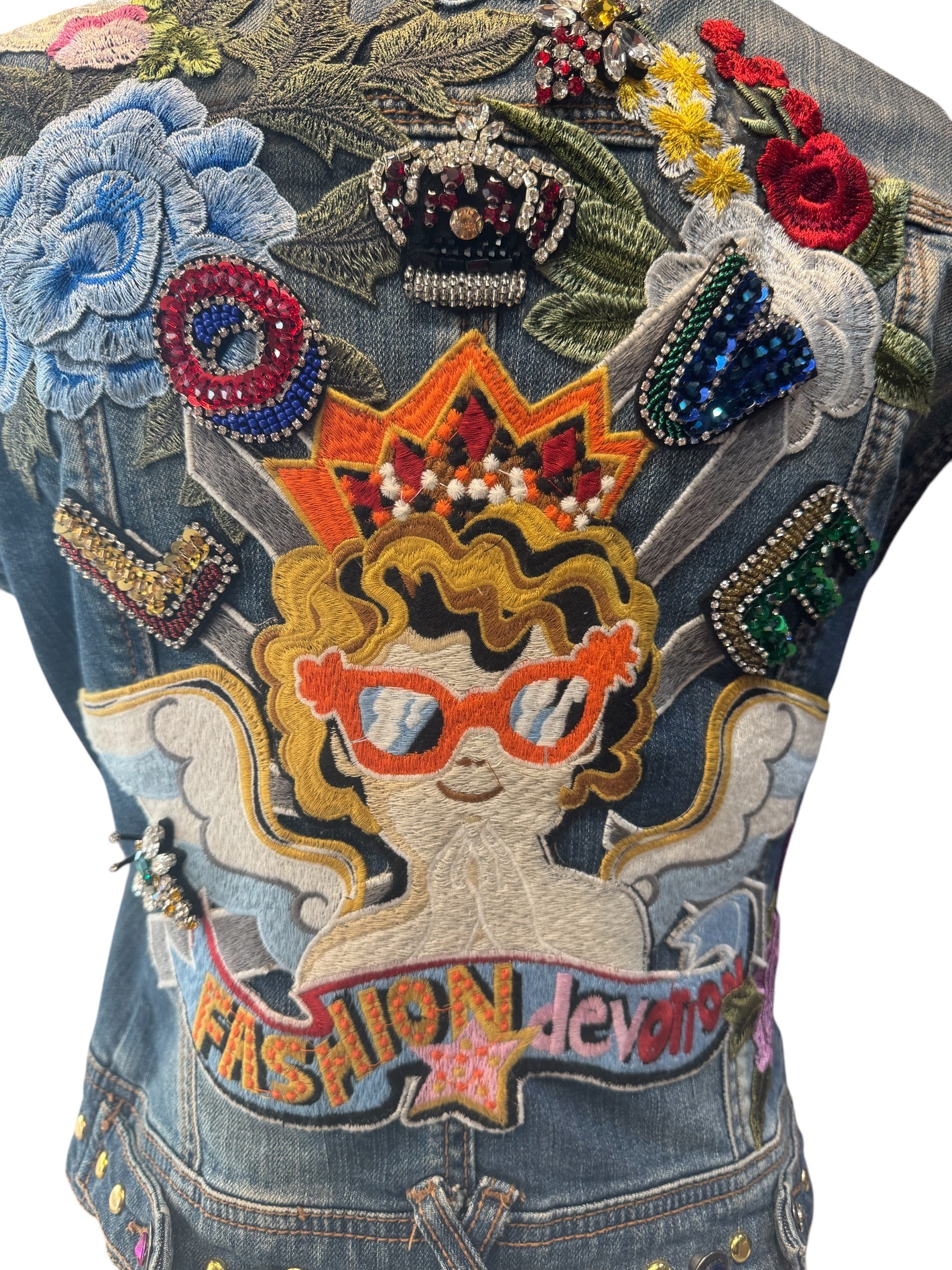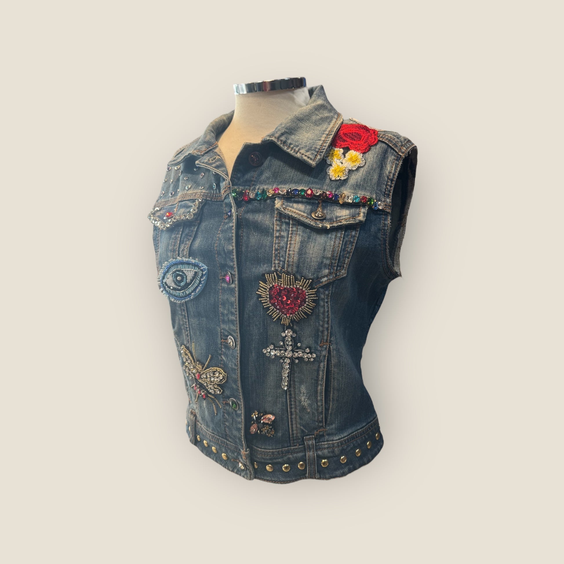 Sumérgete en el mundo del arte wearable con nuestro extraordinario chaleco vaquero bordado, una pieza única que fusiona la tradición del denim con la expresión artística más vibrante. Este chaleco sin mangas es mucho más que una prenda de vestir; es un lienzo de creatividad que cuenta historias a través de cada puntada.