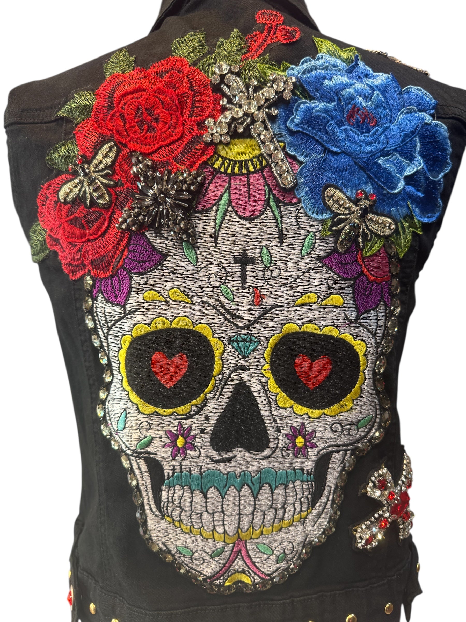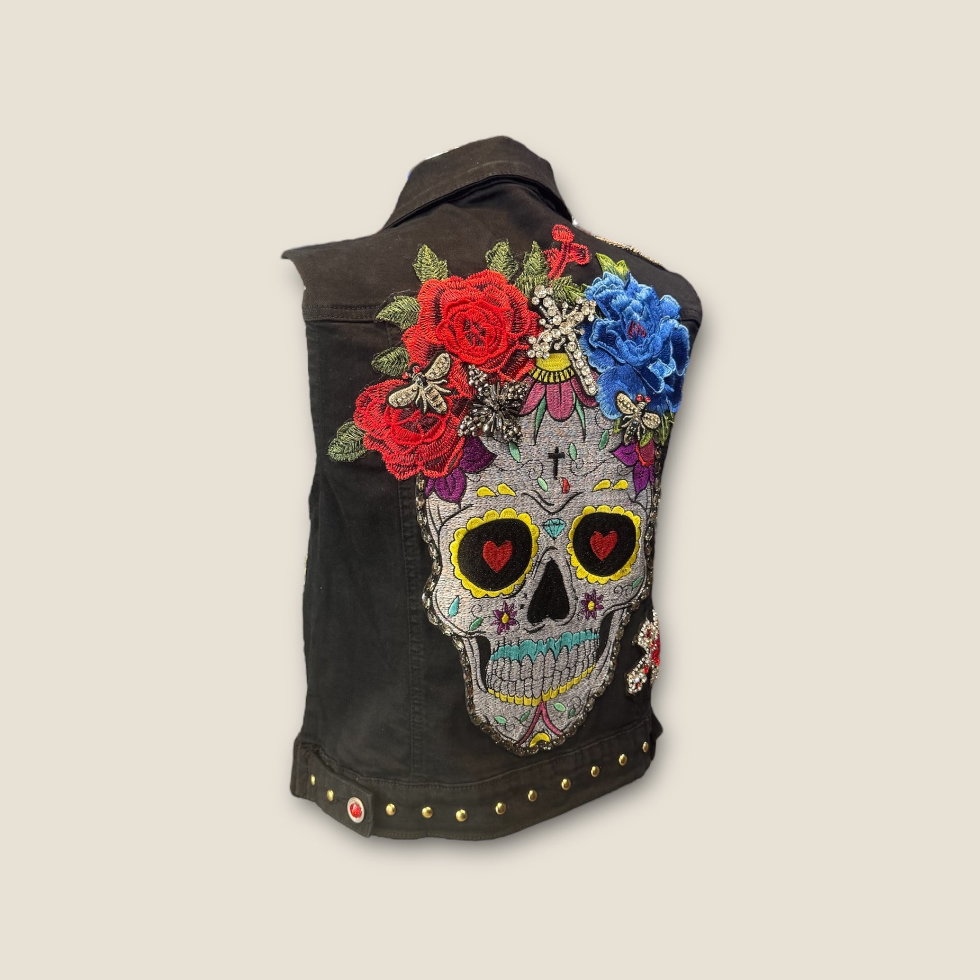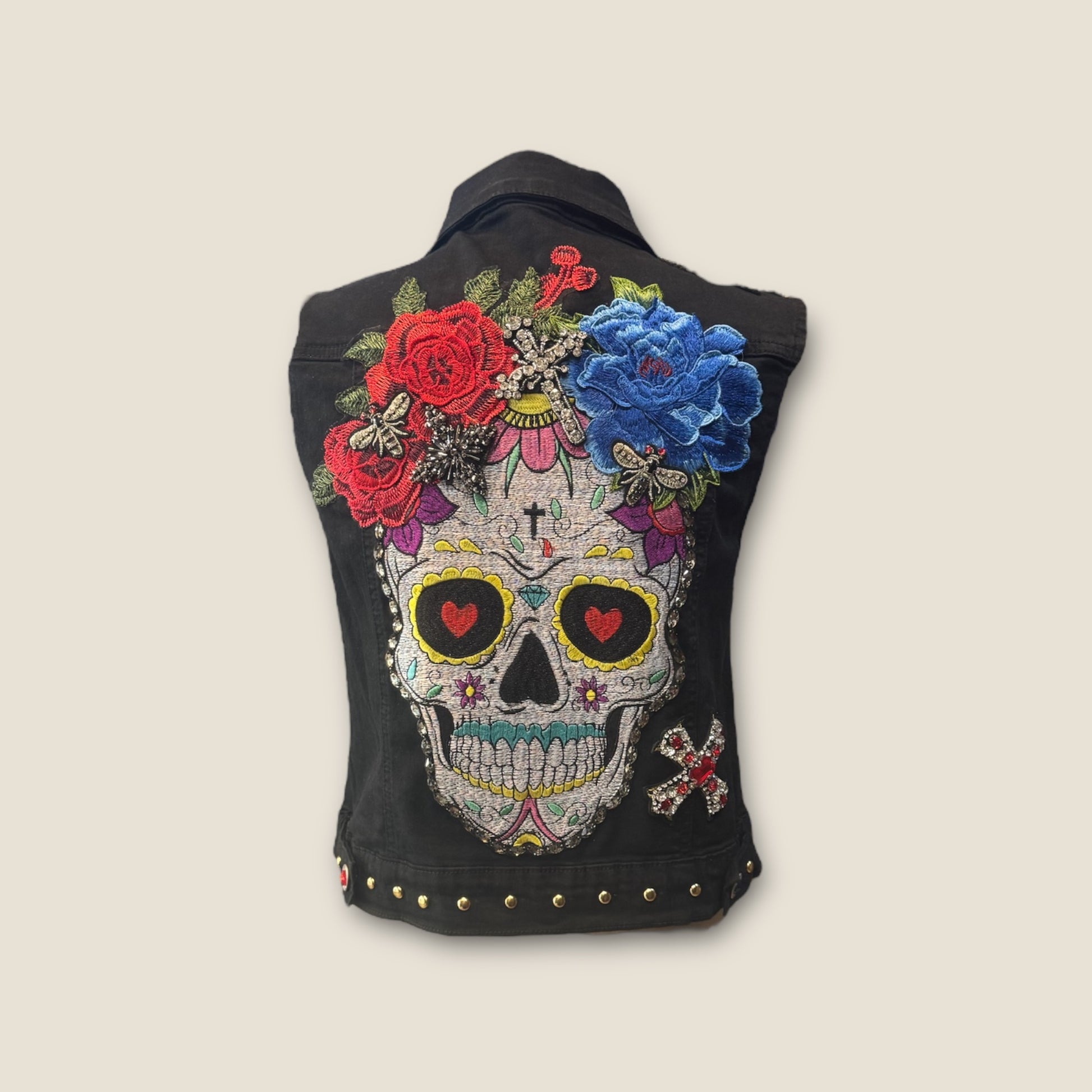 ¡Haz una declaración audaz con este chaleco único y lleno de estilo! Inspirado en el arte del Día de los Muertos, este chaleco de mezclilla negra sin mangas presenta un impresionante bordado en la espalda de una calavera mexicana decorada con flores, corazones y detalles vibrantes. El diseño destaca por sus colores vivos y detalles tridimensionales, incluyendo flores rojas y azules en relieve, además de abejas bordadas que le dan un toque artesanal y original.