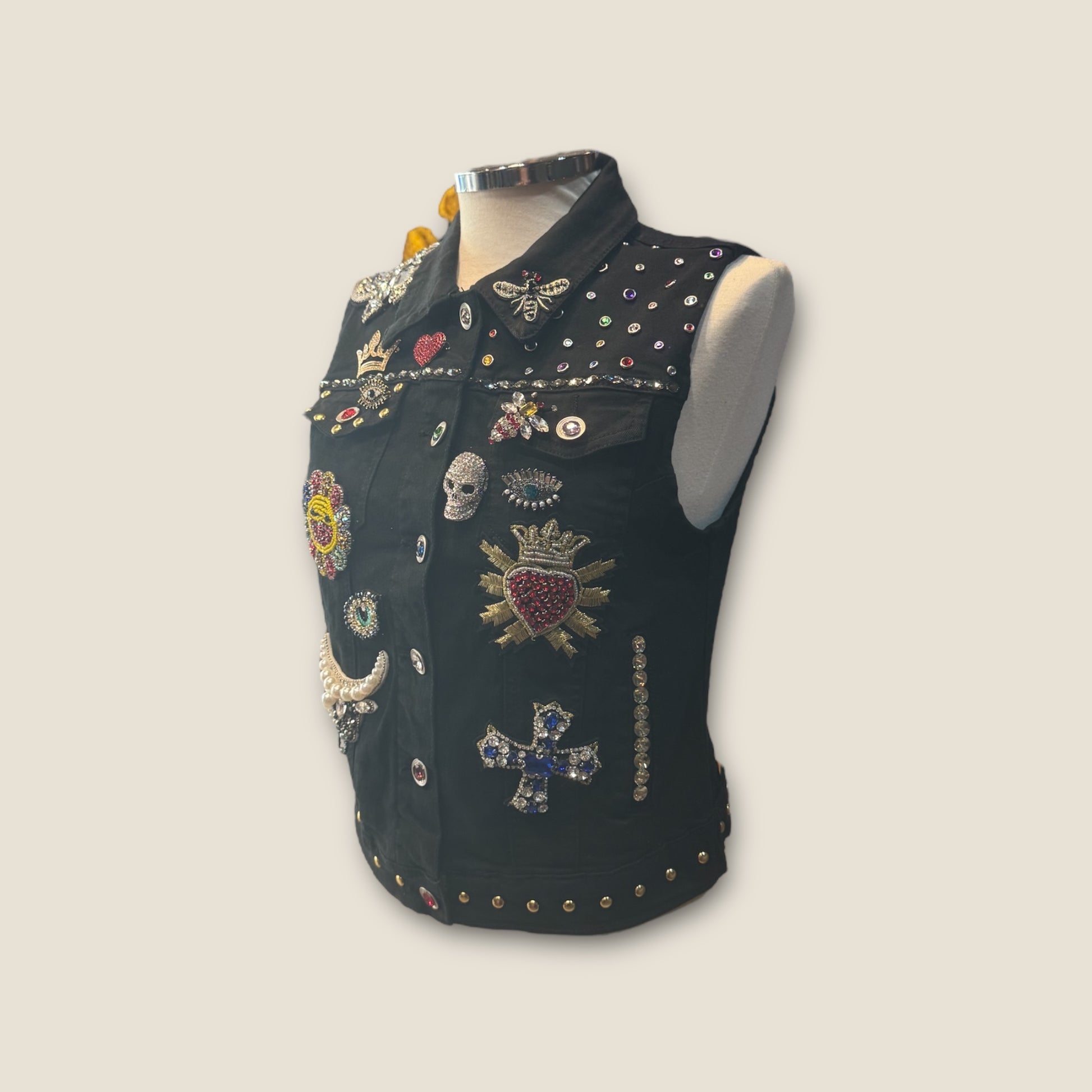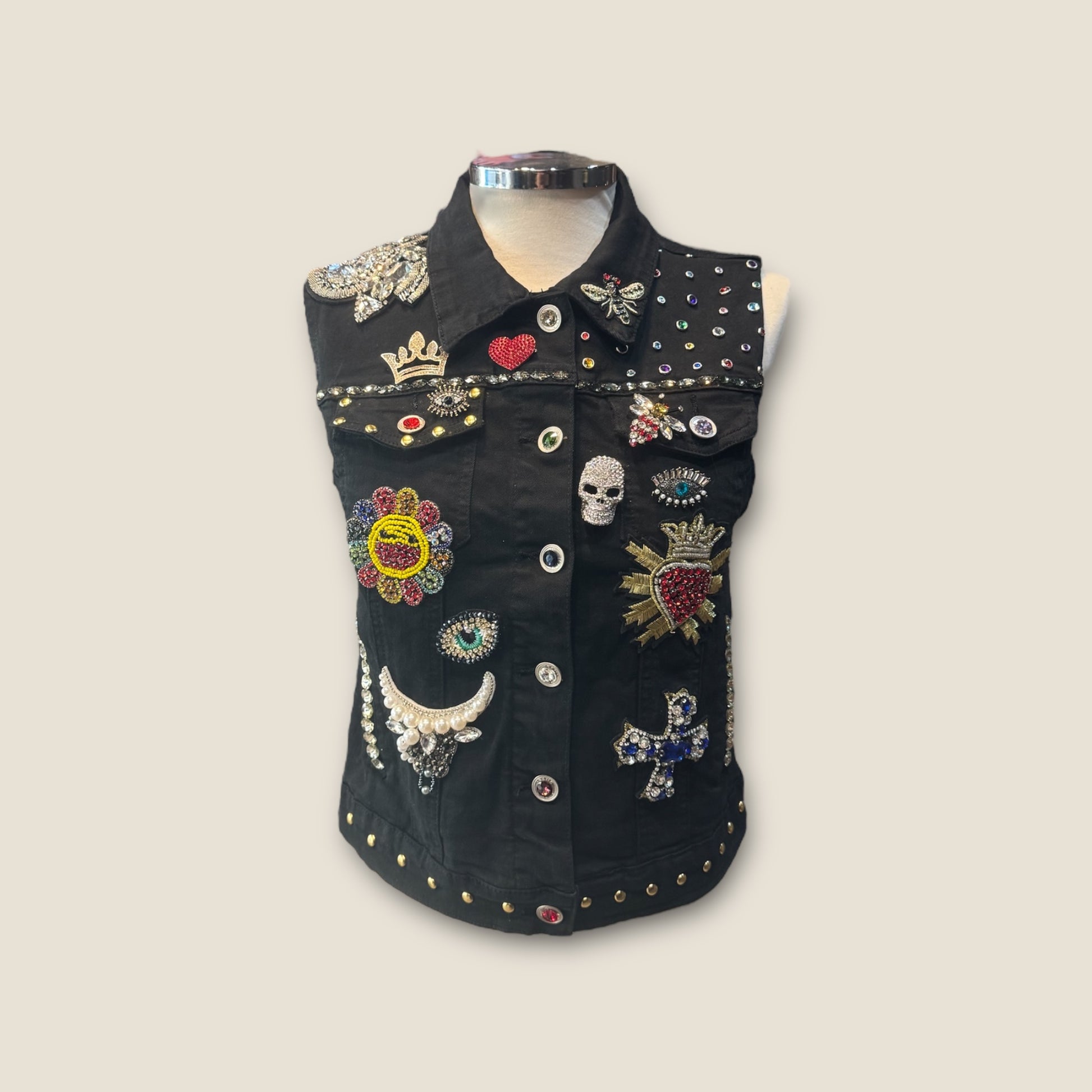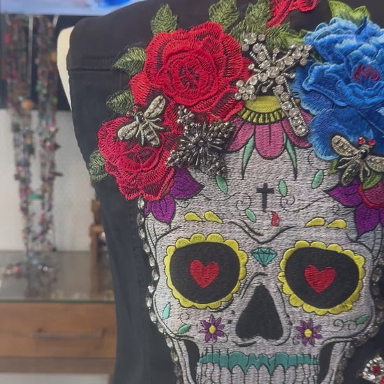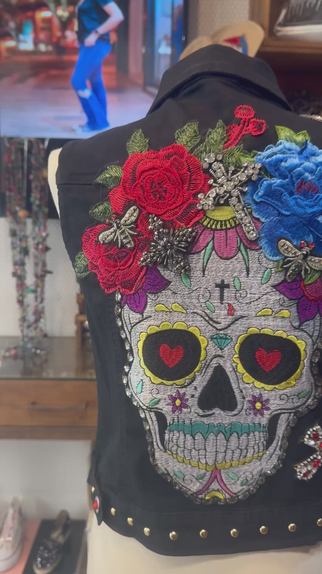 ¡Haz una declaración audaz con este chaleco único y lleno de estilo! Inspirado en el arte del Día de los Muertos, este chaleco de mezclilla negra sin mangas presenta un impresionante bordado en la espalda de una calavera mexicana decorada con flores, corazones y detalles vibrantes. El diseño destaca por sus colores vivos y detalles tridimensionales, incluyendo flores rojas y azules en relieve, además de abejas bordadas que le dan un toque artesanal y original.