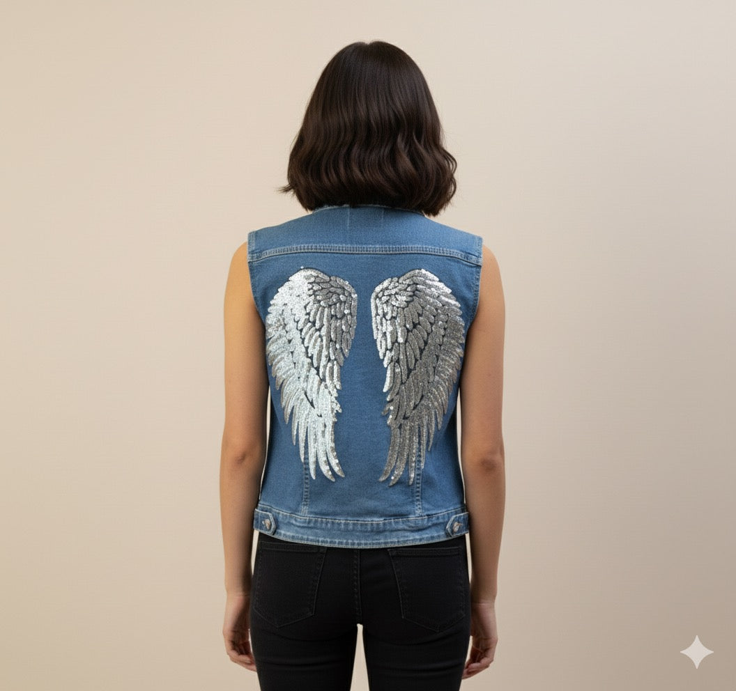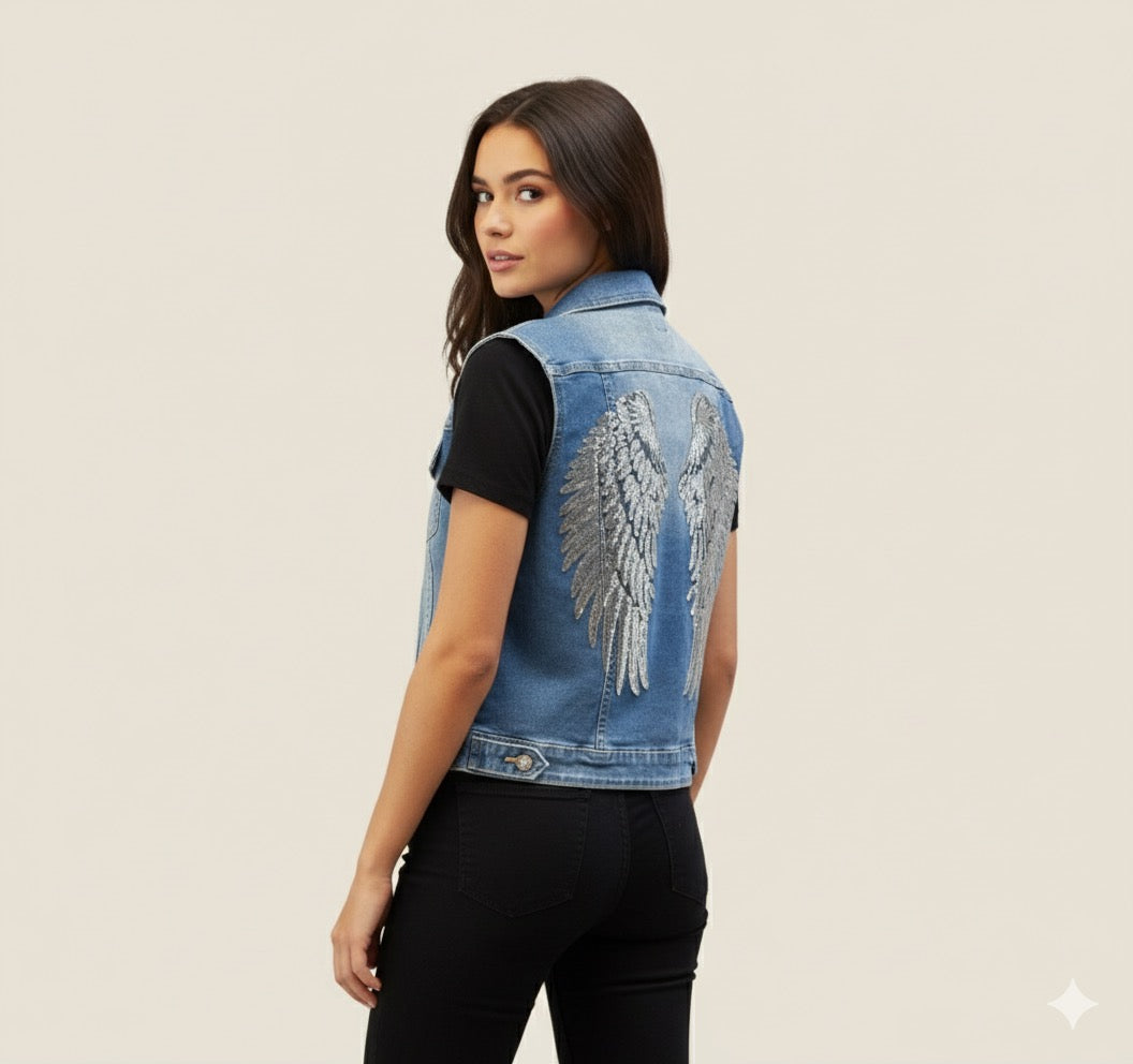 Este chaleco vaquero presenta un diseño único y audaz con alas de lentejuelas en la espalda. El contraste entre el denim clásico y el brillo de las lentejuelas crea un estilo llamativo y moderno. Las alas agregan un toque de fantasía y libertad a tu atuendo, destacando tu individualidad con un toque de glamour. Este chaleco es perfecto para quienes buscan un look original y lleno de personalidad. Añade un toque de brillo a tu estilo diario con este chaleco vaquero que sin duda captará miradas y elevará tu outfit a otro nivel.