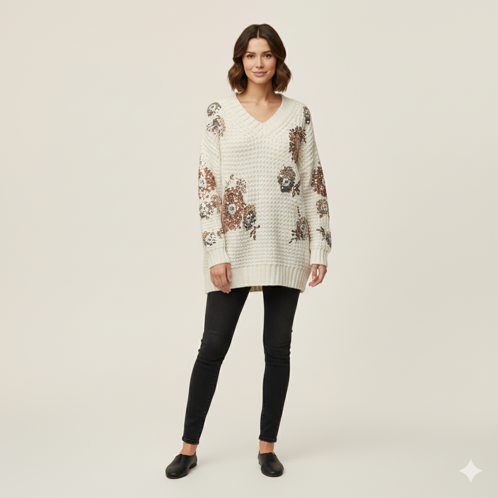 Este es un suéter de tejido grueso en color crema, con un diseño de punto que le da una textura cálida y acogedora. Tiene un escote en forma de “V” pronunciado y ribeteado, lo que le agrega un toque elegante. Está decorado con patrones florales en tonos metálicos como dorado, bronce y plateado, aplicados con lentejuelas que aportan brillo y un estilo sofisticado. Las mangas largas y el ajuste holgado lo hacen ideal para climas fríos, ofreciendo comodidad y estilo al mismo tiempo.